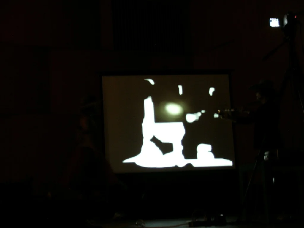 A performance at the 2006 Spring Electronic Music Concert at the UCSC Recital Hall. Although the video quality is not great, there is enough there to get the idea. The screen projection is a system I invented called Sticky Light. A controlled feedback loop is created by pointing a camera directly at the projection. The feedback is then modified and controlled by a custom coded, digital system that causes the light from the flashlights to "stick" to the screen. The light on the screen is also run through custom software to generate the sound directly from the light present on the screen.