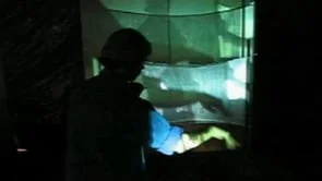 Sticky Light is a technology I created for a production called Softly Spoken, produced and directed by leaf Tine. Softly Spoken was an interactive, storytelling experience told without recognizable language. Sticky Light is a controlled feedback loop between a camera and a projected image, that enables one to effectively sculpt light with their hands. Sticky Light had its first introduction at the 2006 Spring Electronic Music Concert in the UCSC Recital Hall in a production called Doctor and Janitor, a clip of which is also provided here.